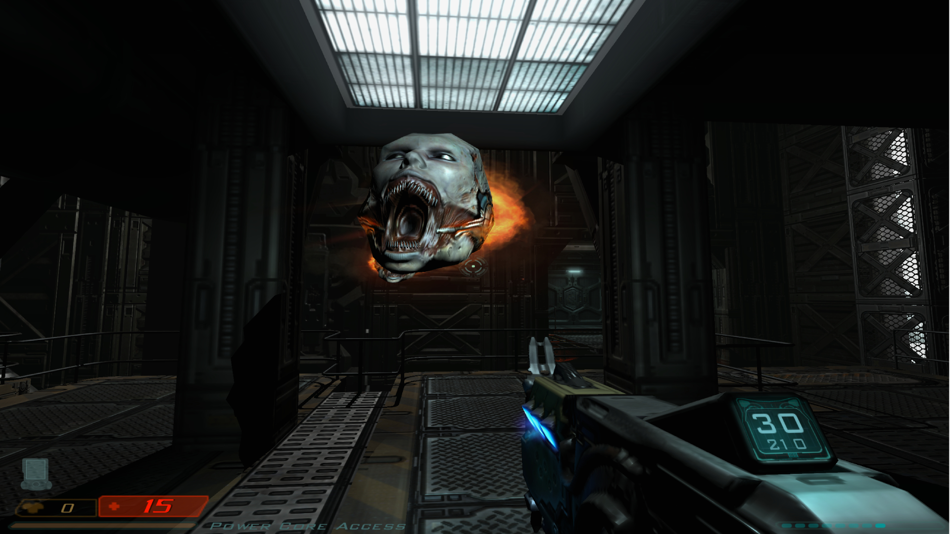 Zwar haben wir einen Tablet-Computer, in dem wir Emails, Videos und Sprachnachrichten sammeln, mit denen wir die Schränke öffnen können, in denen kostbares Loot liegt. Aber die fehlende Karte sorgt gerade am Anfang dafür, dass wir, ohne Ziel, hin und her laufen und nicht wissen, wo eben das nächste Ziel liegt. Was man erst mal als nervig und alt auslegt, ist aber ein eigenes Konzept. Auf einmal springen aus den Ecken die wir kennen dürre Höllenbrut entgegen, welche auf der Suche nach unseren Adern sind. Ich würde sagen, dass Doom III halb schlauchig und eben halb offen ist.